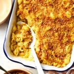 • Preheat the oven broiler and transfer the pasta to the prepared baking dish. Top with the panko and broil for 5 to 10 minutes, or until the topping is crisp and browned.