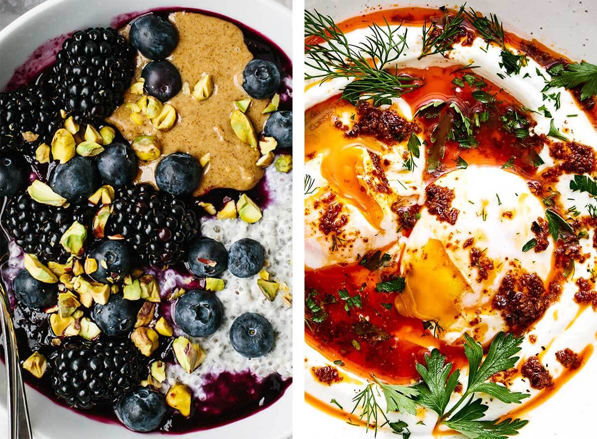 Turkish Eggs: I’ve been loving this savory and perfectly spicy breakfast. The blend of oozy poached eggs, garlicky yogurt, and spiced butter sauce are the most flavorful combination.