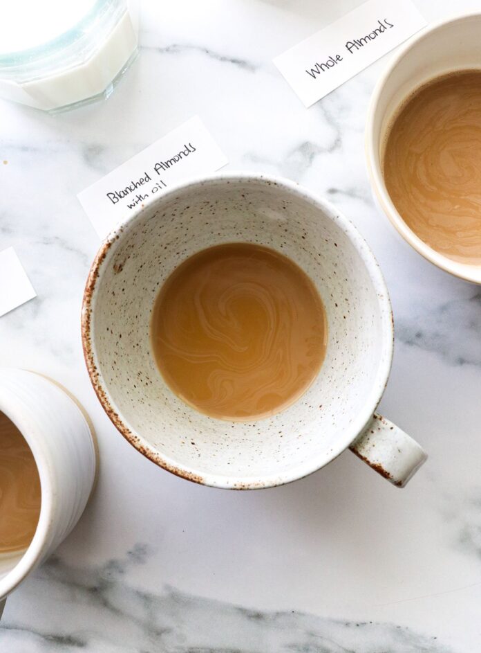 • Skip the Added Oil. The very first option I tested was simply blending blanched almonds and water. This works as a coffee creamer, but I prefer the mouthfeel when the oil is added.