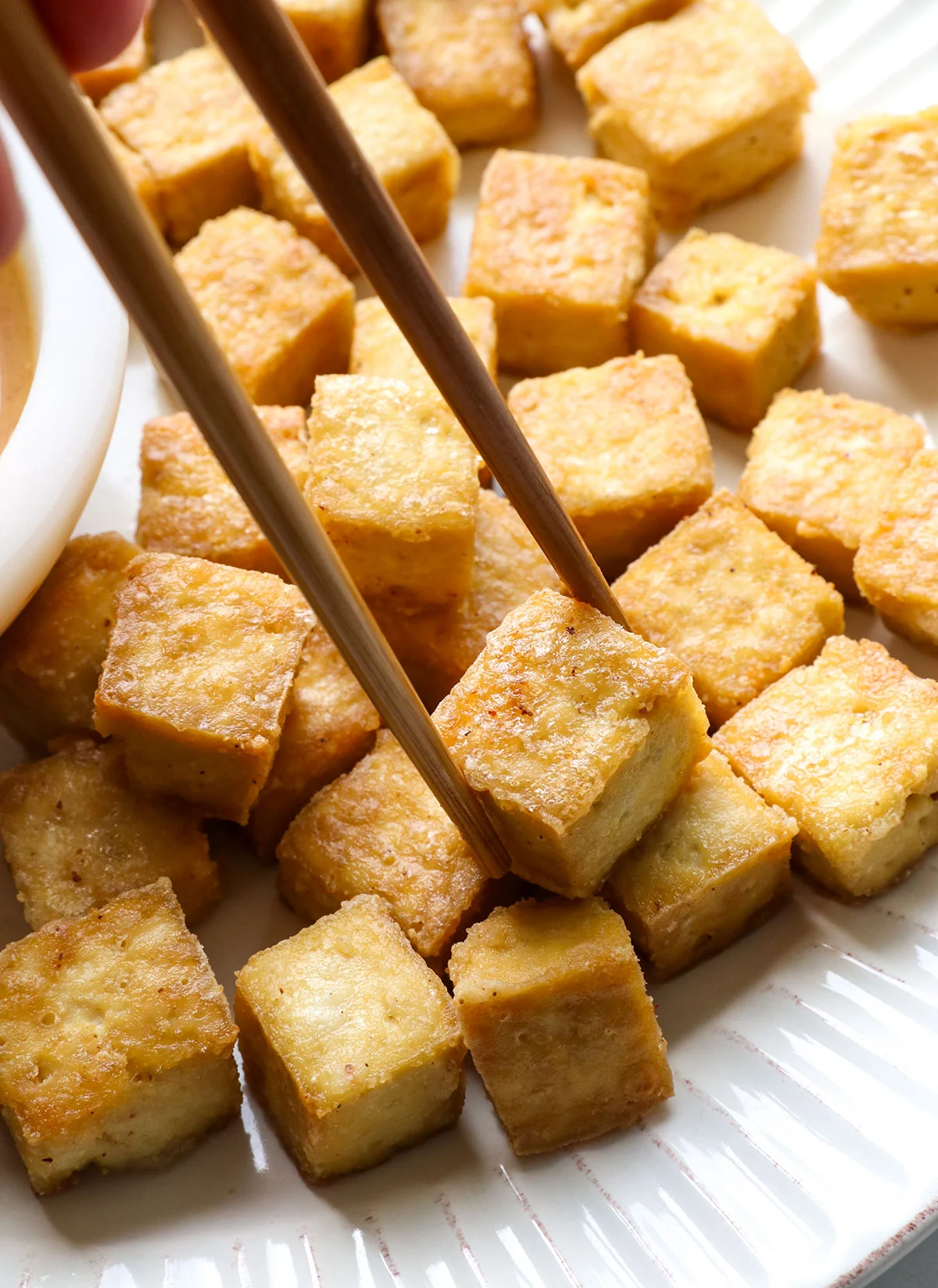 Remove the pan from the oven, flip the tofu pieces over, and bake for 15 more minutes, or until the tofu is golden on the outside. Serve it warm right away, with your favorite dipping sauce, or add it to your favorite meal for extra protein. Leftover tofu can be stored in an airtight container in the fridge for up to 5 days.
