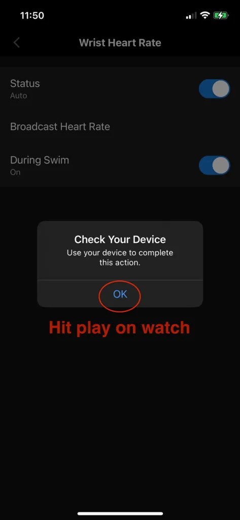 Make sure to download the Garmin Connect app. Ensure the device is connected/reading data. From the Settings section, go to Watch Sensors > Wrist Heart Rate is enabled with Broadcast Heart Rate turned on. Next, check your Garmin watch and tap the PLAY icon to enable.