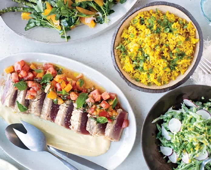 His Grilled Tuna with Ginger Mustard and Tomato Basil Salad is a perfect example, with clean, balanced flavors that let the ingredients shine. Seared tuna, brushed with a gingery mustard glaze, meets the freshness of ripe tomatoes and basil for a dish that feels as refined as it is relaxed.