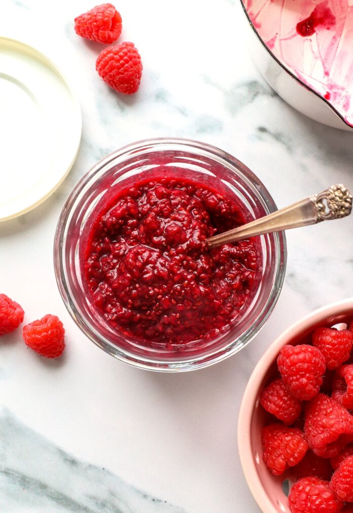 I originally needed this recipe while working on almond flour thumbprint cookies. I wanted a jam that was naturally sweetened with maple syrup, but I didn’t want to run to the store to buy pectin. Luckily, chia seeds make an easy swap!