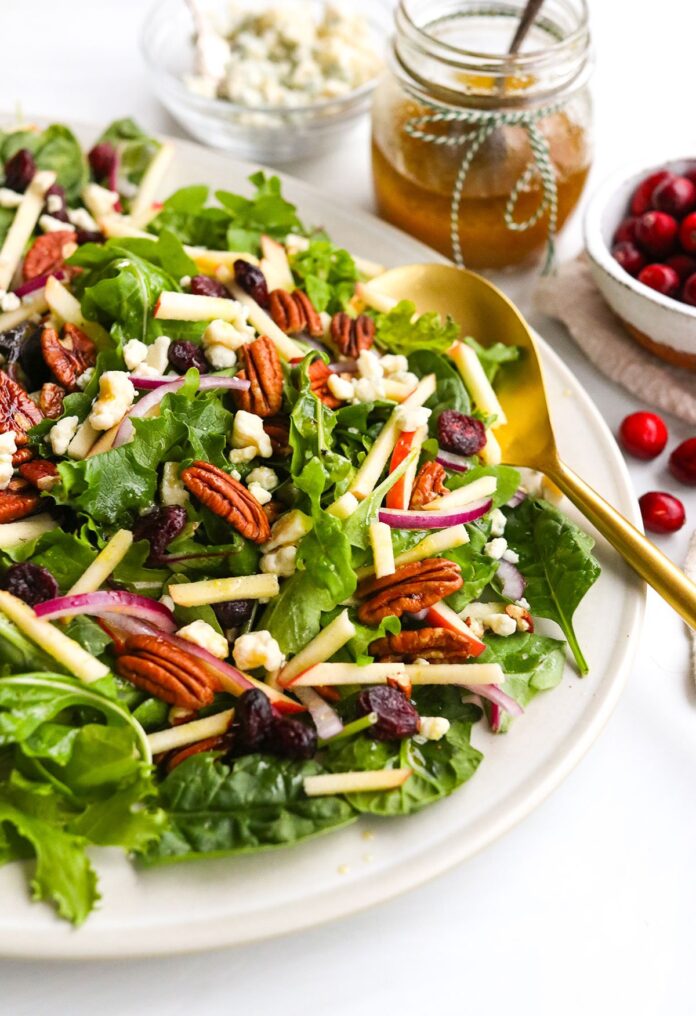 Topped with crunchy pecans and chewy dried cranberries, this salad looks as festive as it tastes, with pops of red and green throughout. Crunchy red apple is added shortly before serving, for extra texture and sweetness.