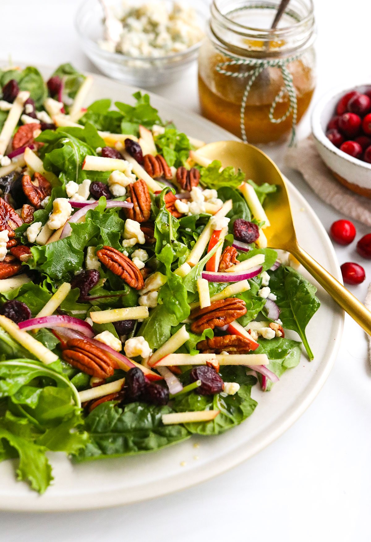 • To assemble the salad, add the leafy greens to a large salad bowl, and top them with the sliced apples, onions, dried cranberries, and pecans. You can add the blue cheese on top, too, or serve it on the side with a spoon, for guests who might not enjoy cheese.