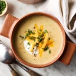This potato soup recipe is the ultimate comfort food for a cold day! It’s like a loaded baked potato in soup form—the thick, creamy, savory soup is piled high with toppings like sour cream, shredded cheese, and green onions or chives. Jack loves it so much that he can polish off half the pot in a single night.