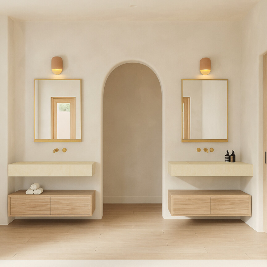 In the primary closet, Moroccan clay zellige tile will run from the bathroom straight into the closet, making it feel warm, earthy, and cohesive. One thing I was intentional about avoiding: too much open shelving. In a smaller-footprint home, closed cabinetry can be a lifesaver. I wanted these rooms to hold real life and contain it, rather than display it.
