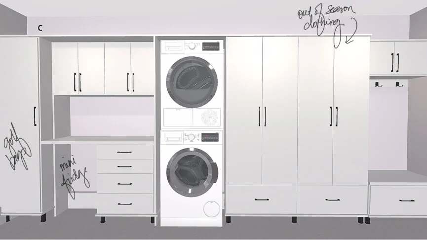 True story: this space almost became a DIY project, and I’m so glad that it didn’t! In an effort to save on the budget, I started piecing together components from a big box retailer. But the room’s unusual shape—caused by the recessed washer/dryer and mechanical units on the other side—made it incredibly tricky.