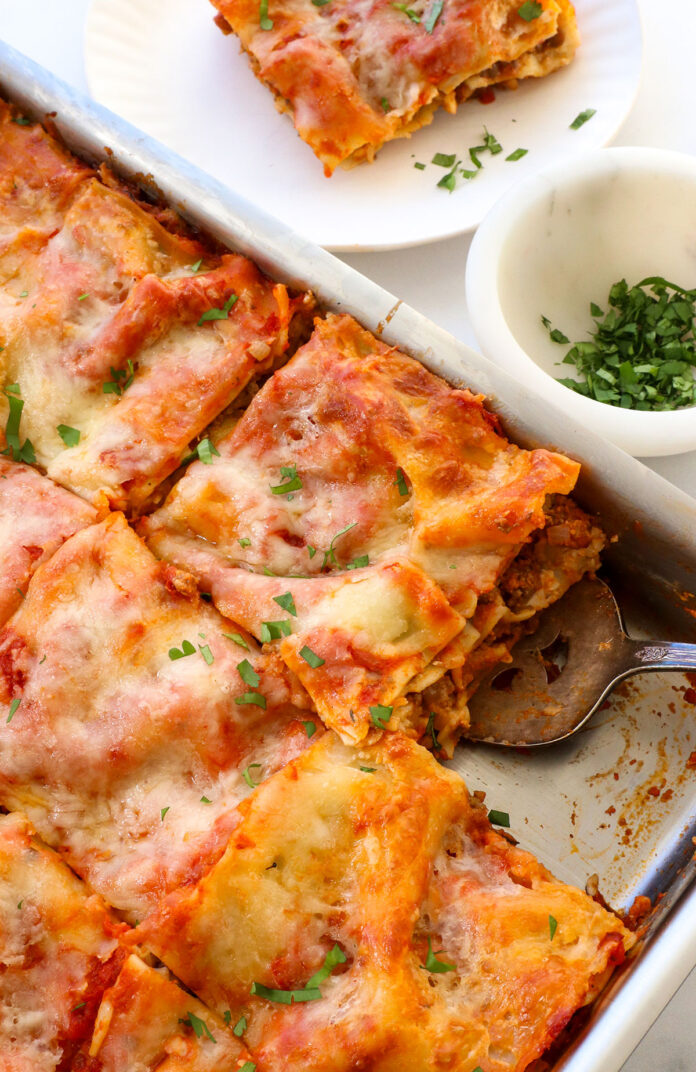 Today, I’ll show you how to use cottage cheese in lasagna so that it goes completely unnoticed. We’re also adding a not-too-sneaky source of fiber to the meat sauce, which makes this recipe budget-friendly (no need to buy 2 pounds of beef) and more nutritious.