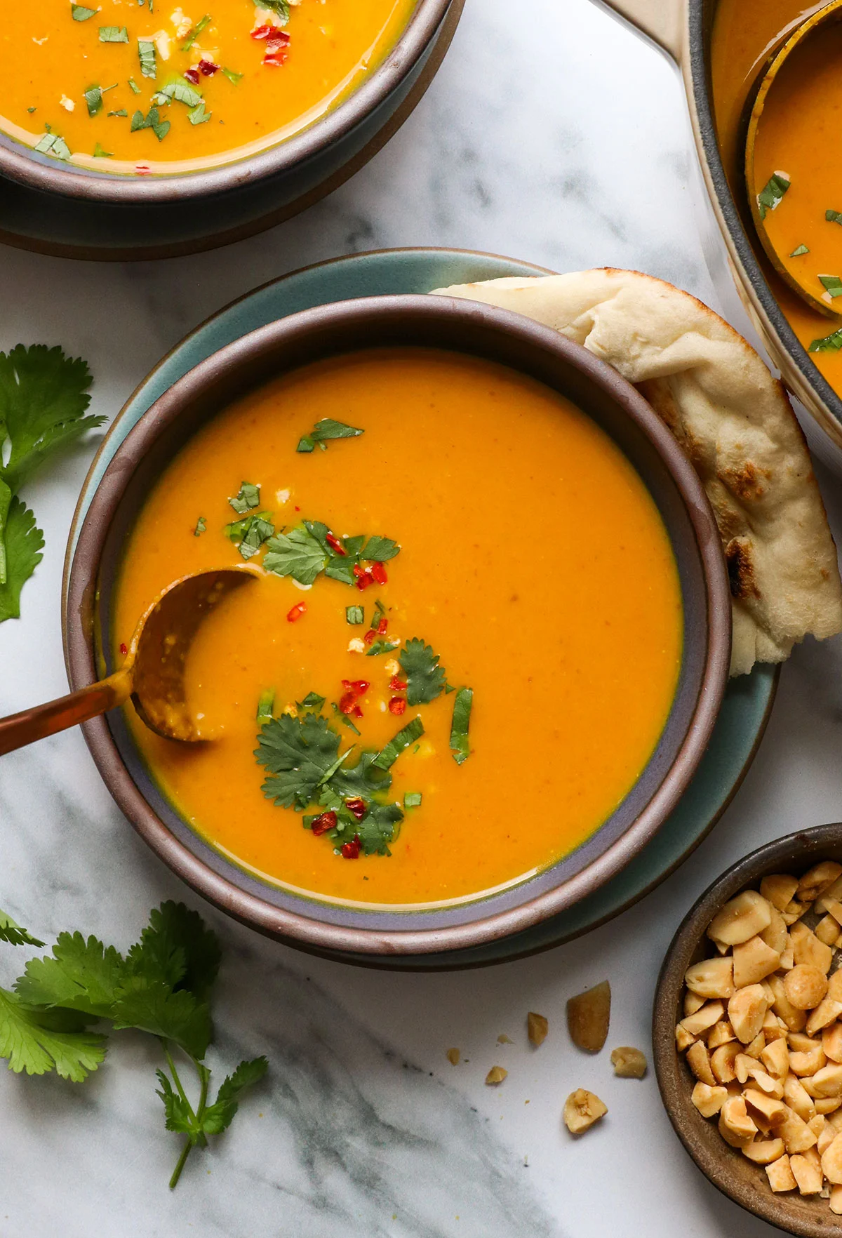 You can add the chopped cilantro directly into the hot soup and let it wilt before serving, or just serve it on top as a garnish. I also like to add chopped peanuts on top for extra texture, but you can add anything you like.