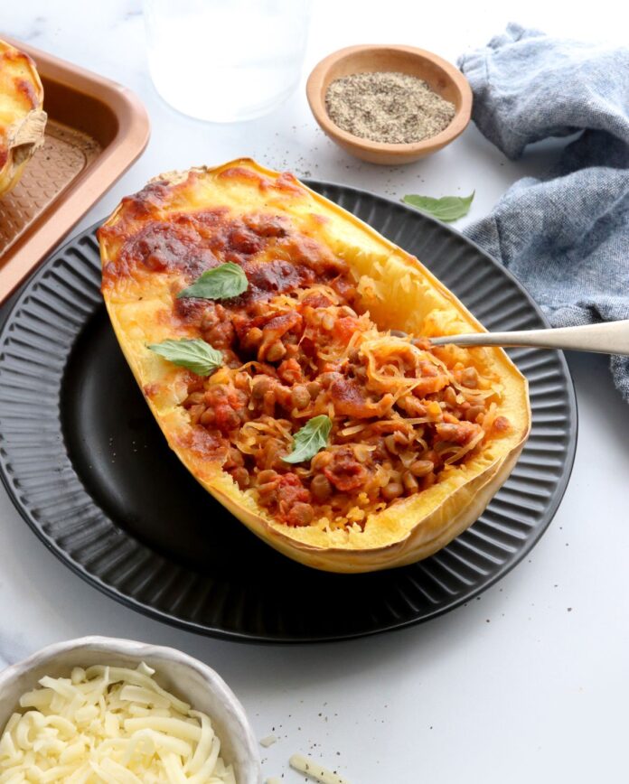 spaghetti squash stuffed with lentils and topped with cheesespaghetti squash stuffed with lentils and topped with cheese