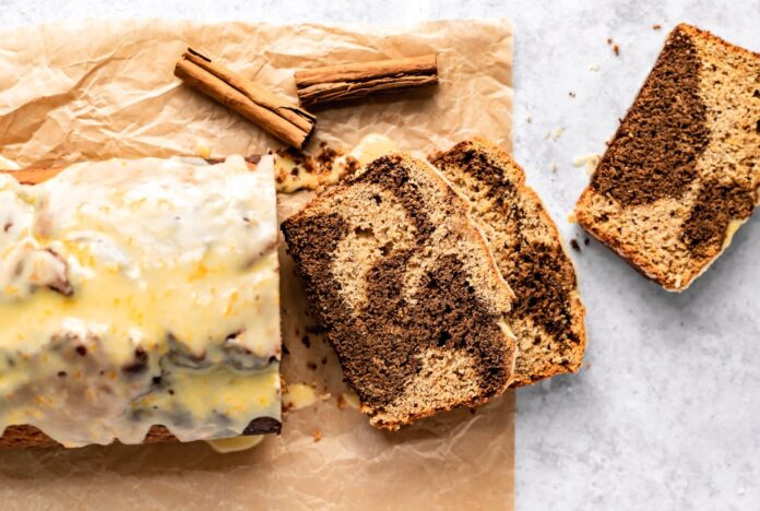 orange gingerbread swirl loaf sliced on parchment paper