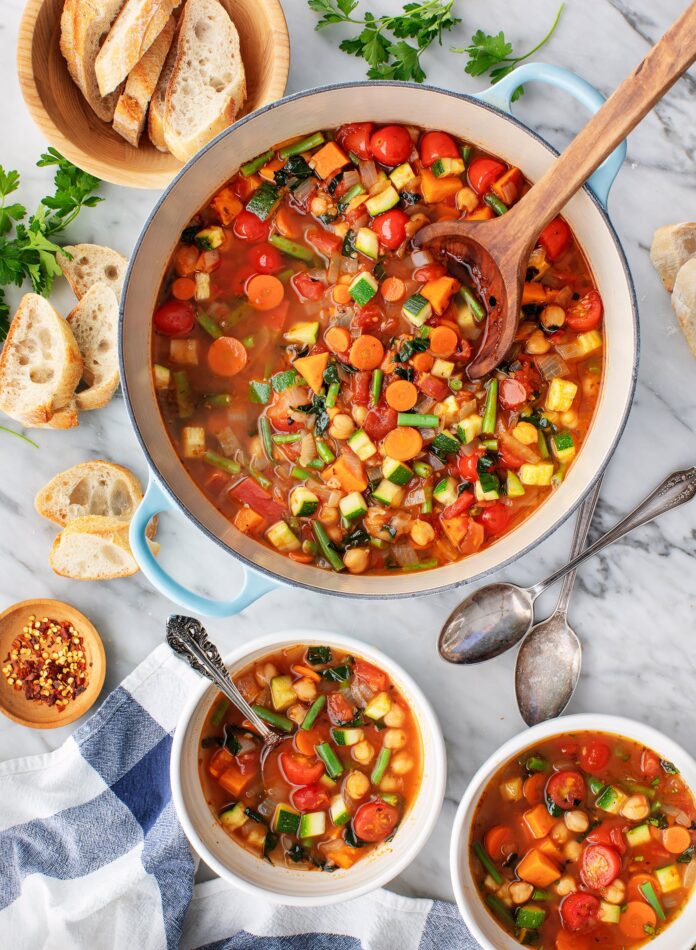This vegetable soup recipe is a healthy, homemade meal that’s great for cold days. It’s flexible and easy to make with simple pantry ingredients and whatever vegetables you have on hand.