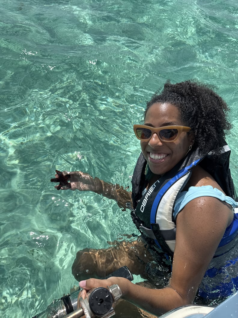 After my morning Hydrow session, we had breakfast and headed to the dock for our three-hour private charter with conch and lobster diving. I can’t swim, so no diving for me. But I strapped on my life jacket and happily waded in the clear blue waters with the rest of the editors, feeling more weightless than I’d felt in months. I let the ocean lift up my legs and helped onboard the conch shells as the divers came back up from the bottom of the ocean.