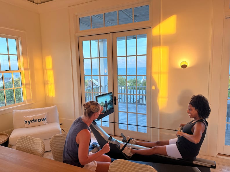 First up on the agenda after getting settled was lunch (a blackened grouper burger for me) and then a guided Hydrow workout led by Hydrow athlete Mac Evans, who rowed D1 at Rutgers University. We started with a quick yoga and stretch session to shake of some of the plane stiffness. Then, we took to the rower one by one while Mac corrected our form, implemented pro techniques, and helped us maximize the total-body benefits of the Hydrow machine. I was quickly humbled by her instruction, as she guided my hands to the right positioning and demonstrated the 3-2-1 method designed to help master the rowing stroke and optimize power output.