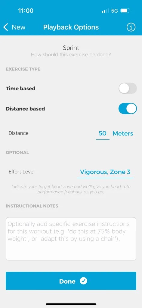 You can create distance workouts by adding at least one distance-based exercise with a target distance or duration. Choose ‘Distance-based’ instead of our standard Timed or Repetition-based options.