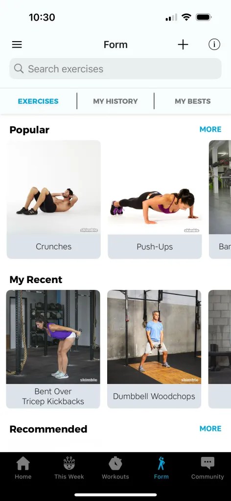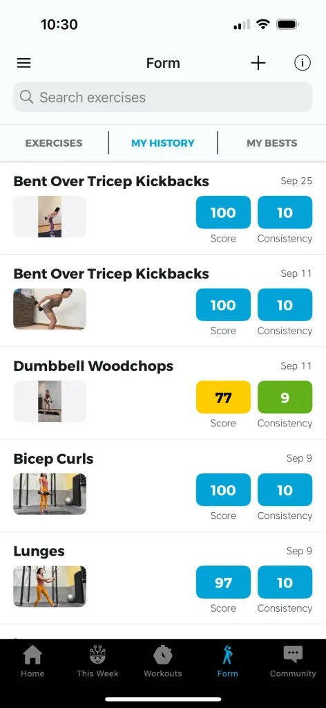 Ready to level up?! Head on over to the FORM tab and browse thousands of exercises you can get Form Feedback on. Tap on the MY HISTORY or MY BEST options to see a list of exercises you’ve completed with Form Feedback.